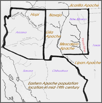 In pre-historic times, the Athapaskan-speaking ancestors of the Lipan Apaches migrated from the forests of western Canada into the southern Great Plains. There was a split of Athapaskan-speaking people into what we call now Western Apache and Eastern Apache groups.1 The predecessors of the Western Apaches (Mescalero, Chiricahua, Cibucu, White Mountain) and the Navajo crossed the Rio Grande River into the southwestern US. The Apache settled in the Four Corners area of Arizona and New Mexico and areas abandoned by the Pueblos because of drought around 1300. The Navajos followed and pushed the Apaches farther south. The Eastern Apache (Kiowa Apache, Jicarillas and Lipan)remained further east in Texas and eventually west into New Mexico until historical times.