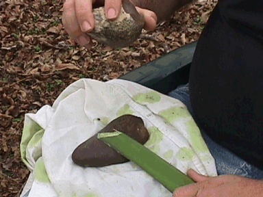 | We put the leaf on the anvil stone and use the hammer stone to pound on the leaf. |