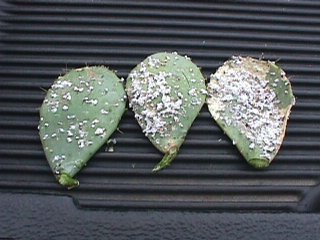 There are usually hundreds of these white puffs all over the cactus pads. When the Cacti have beetles on them you can see them from a distance.