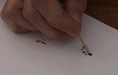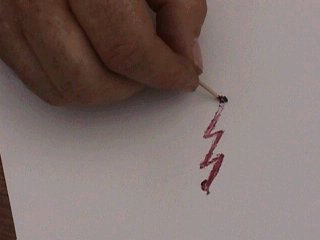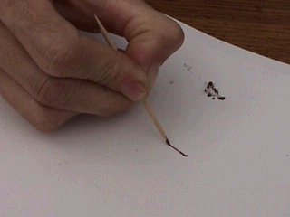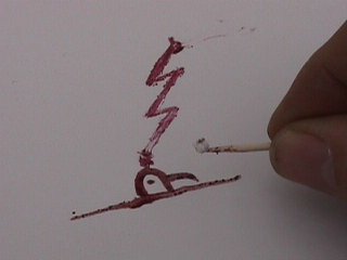 The white fuzz is sticky and sticks to the end of the toothpick. This makes a nice small brush. Using this brush I take some of the red dye and draw with it on paper.