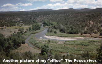 That's me in the red shirt. My good buddy Bill Cruz is next to me. Bill is the world's leading expert in Pecos Pueblo Indian pottery. He can tell you all about where and when the pottery was made just by looking at a small piece of a broken pot. The National Park Service ranger lady ( the good lookin one in the picture ) is Genavive Head. Gen was my crew chief. Gen is an expert on all kinds of things about archeology and anthropology. We all worked together in a archeological survey of the park.