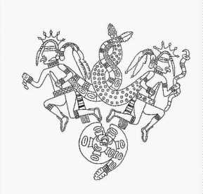 This is my favorite Caddoan design from Spiro. The twin snake dancers. It is an engraving on the bottom of a conch shell cup. Notice the rattle snake tails coming off the dancers backs. They are dancing over a coiled rattle snake with horns. The round things under their ears are copper or wood ear spools. Ear spools are like big earrings. They are wearing fancy headdresses with feathers and beads. Are these pictures of real dancers in costumes or are these imaginary mythological dancers?